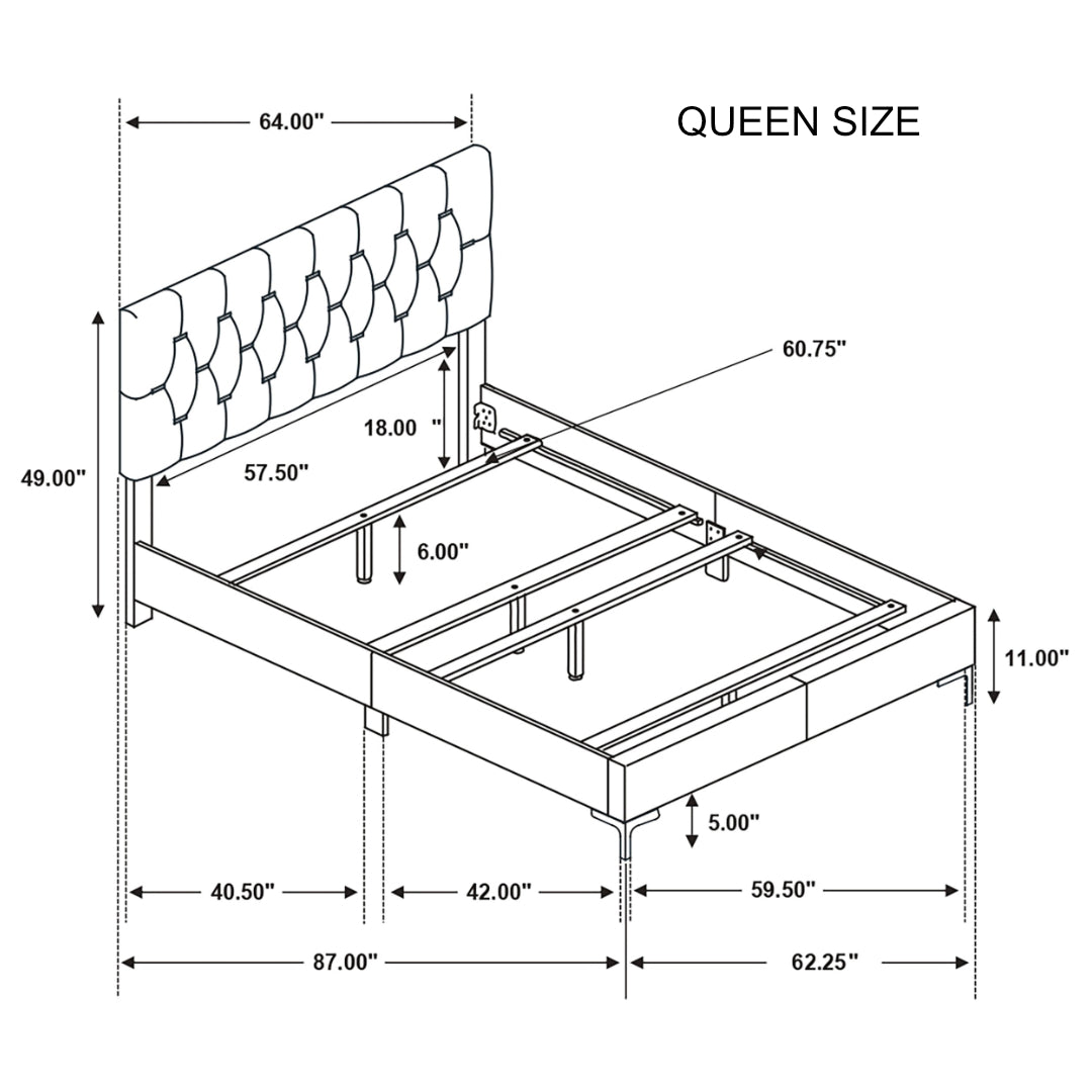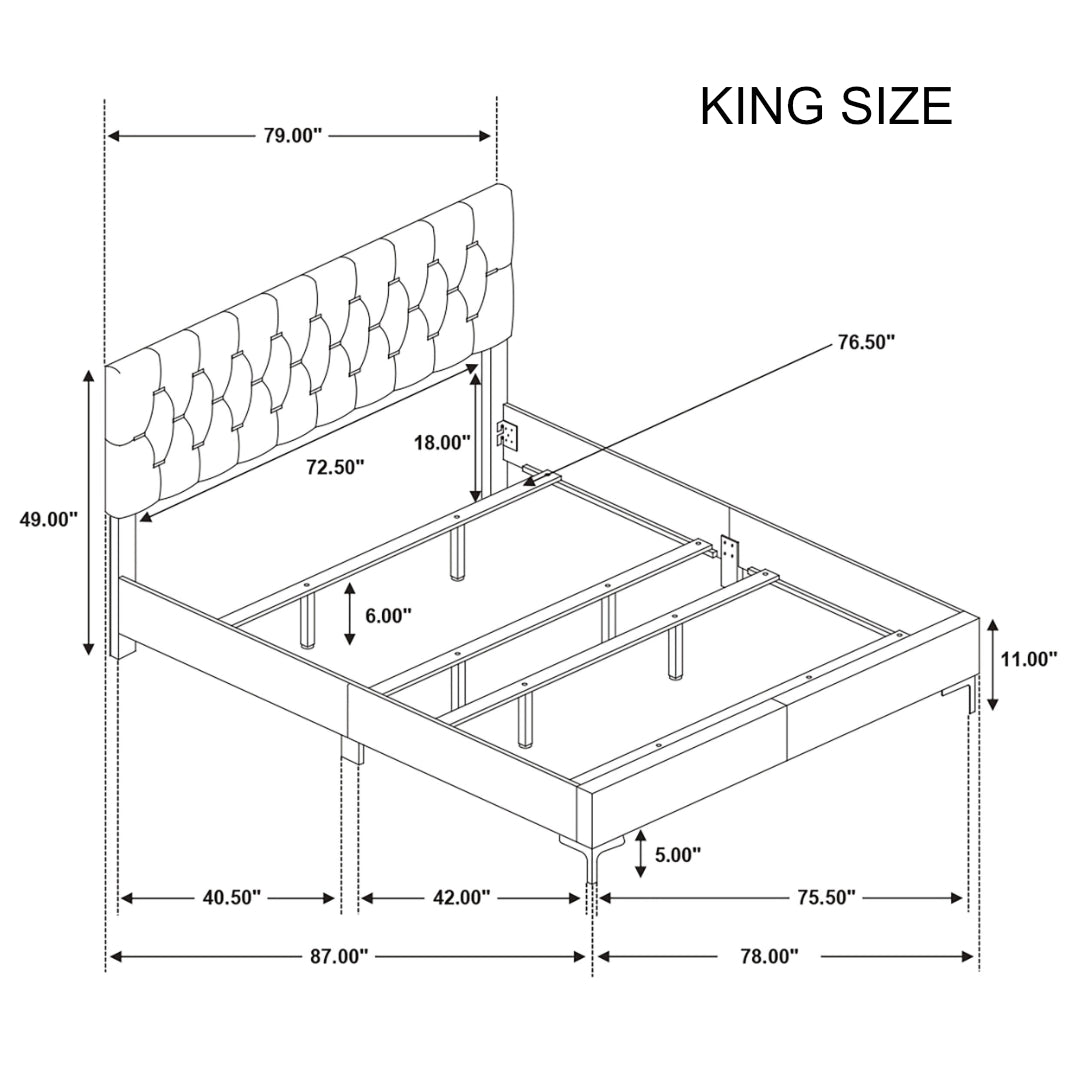 • Diamond tufted headboard accented with gold bar buttons lend a luxe look